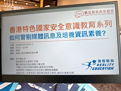 【23/03花絮回顧】《如何警剔媒體訊息及培養資訊素養》教師講座InspireHK3月23日讀畢需時 1 分鐘2026年3月23日(一)早上,本會勵志教育青年基金創辦人兼主席李子楓先生應「東華三院呂潤財紀念中學」邀請舉辦《香港特色國民認知教育系列 – 如何警剔媒體訊息及培養資訊素養?》講座,並以深入淺出的方式為全校教職員講解媒體及資訊警剔重點訊息和手法,並透過全球不同新聞事件了解各種手段,包括:新聞造假、價值觀扭曲、情緒煽動、辨識假新聞等的案例。
