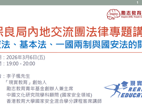 2026年3月6日(五)晚上,本會勵志教育青年基金創辦人兼主席李子楓先生應「保良局青少年事務部及青年創業服務中心」邀請,為參與了由「民政及青年事務局」資助機構舉辦的《內地交流團》,講解《香港特色國民認知教育 – 憲法、基本法、一國兩制與國安法的關係》線上講座,並以深入淺出的方式為參加者們進行非傳統說明。